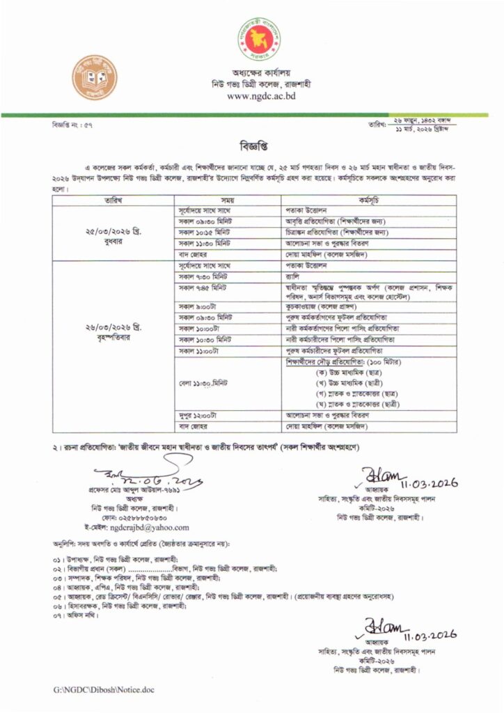 ২৫ মার্চ গণহত্যা দিবস ও ২৬ মার্চ মহান স্বাধীনতা ও জাতীয় দিবস-২০২৬ উদ্যাপন উপলক্ষ্যে নিউ গভঃ ডিগ্রী কলেজ, রাজশাহী’র কর্মসূচি
