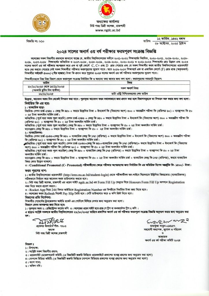 অনার্স ৩য় বর্ষ ফরম পূরণের সংশোধিত বিজ্ঞপ্তি