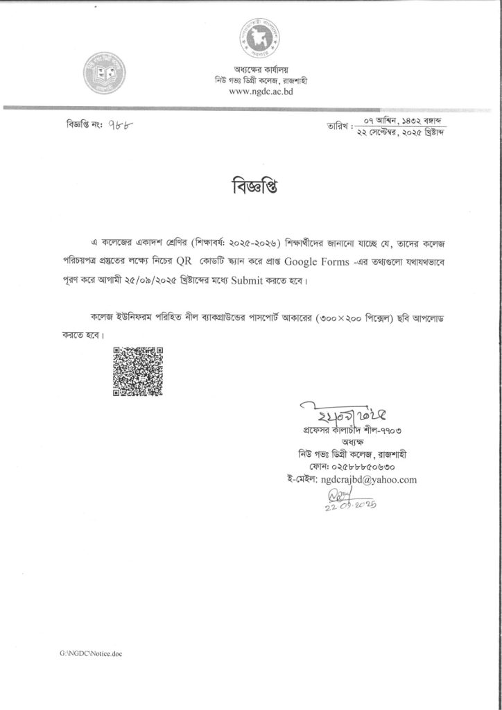 একাদশ শ্রেণির শিক্ষার্থীদের কলেজ পরিচয়পত্র বিষয়ে বিজ্ঞপ্তি