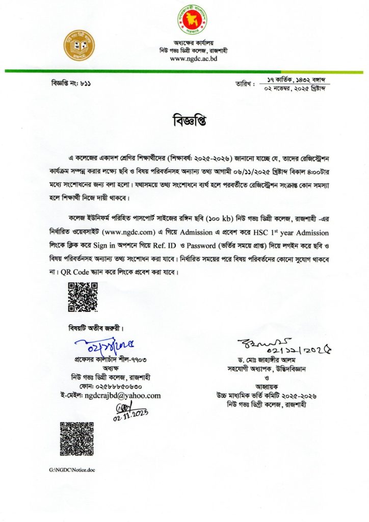 একাদশ শ্রেণির শিক্ষার্থীদের রেজিষ্ট্রেশন সংক্রান্ত বিজ্ঞপ্তি