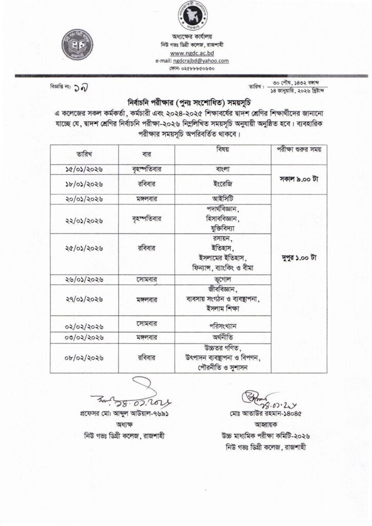 দ্বাদশ শ্রেণির নির্বাচনী পরীক্ষার (পুনঃ সংশোধিত) বিজ্ঞপ্তি