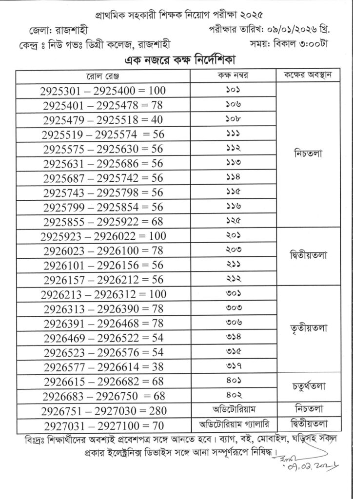 প্রাথমিক বিদ্যালয়ের সহকারী শিক্ষক নিয়োগ পরীক্ষা ২০২৫ এর কক্ষনির্দেশিকা