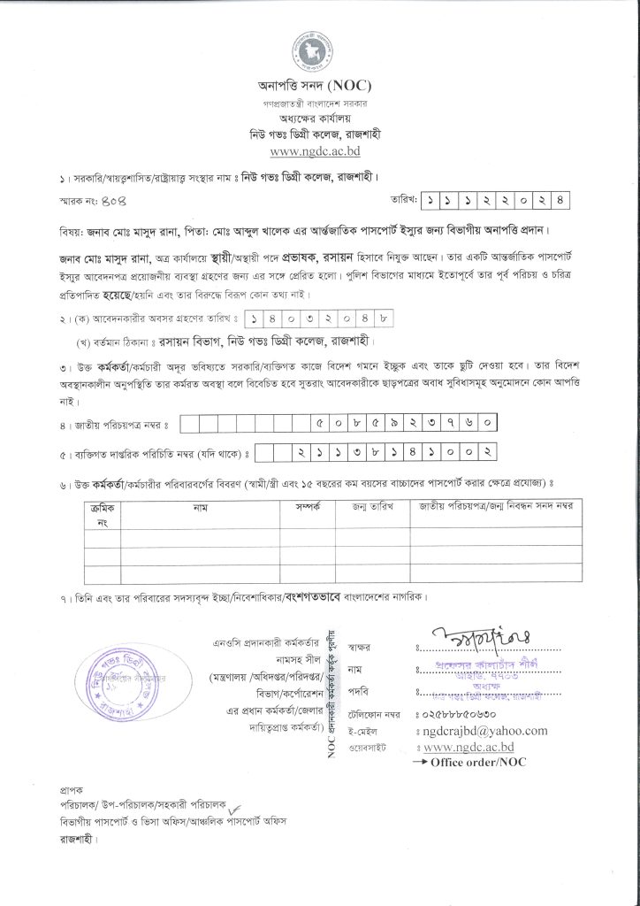 মোঃ মাসুদ রানা, প্রভাষক, রসায়ন এর আন্তর্জাতিক পাসপোর্ট এর বিভাগীয় অনাপত্তিপত্র