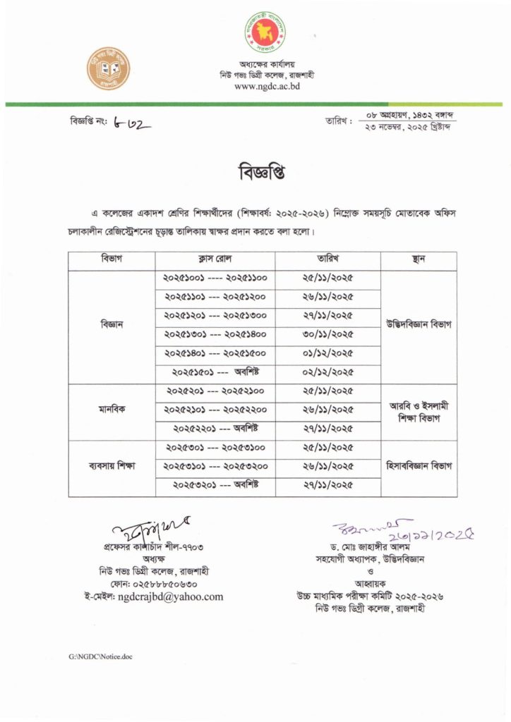 ২০২৫-২০২৬ শিক্ষাবর্ষের একাদশ শ্রেণির শিক্ষার্থীদের রেজিষ্ট্রেশনের চুড়ান্ত তালিকায় স্বাক্ষর প্রদানের বিজ্ঞপ্তি