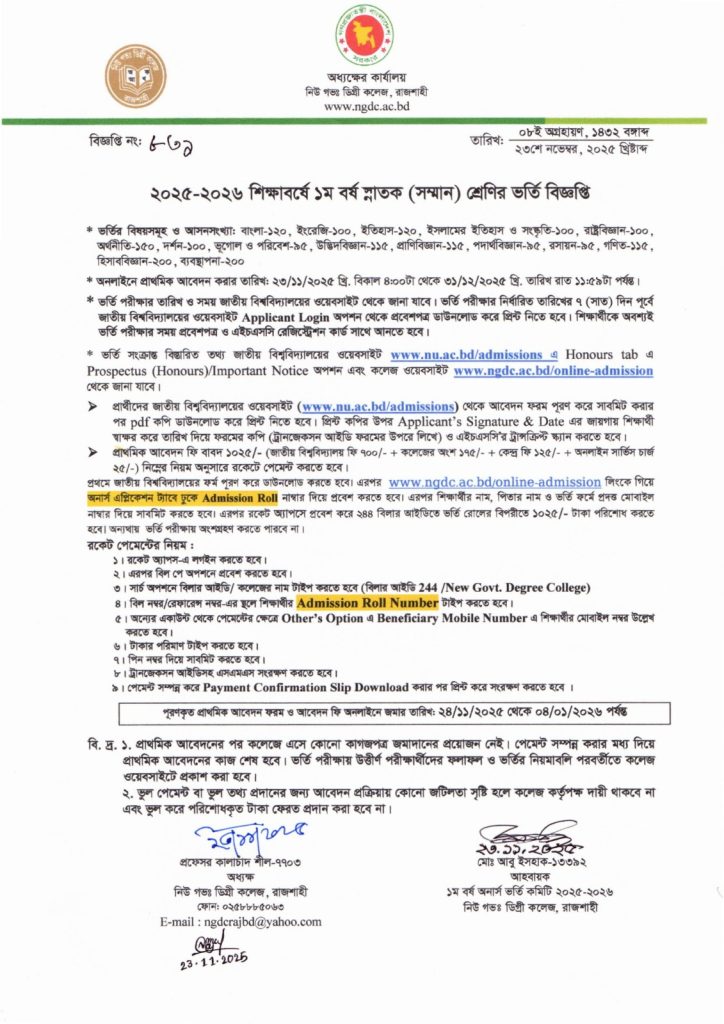২০২৫-২০২৬ শিক্ষাবর্ষে ১ম বর্ষ অনার্স শ্রেণিতে ভর্তির প্রাথমিক আবেদনের বিজ্ঞপ্তি